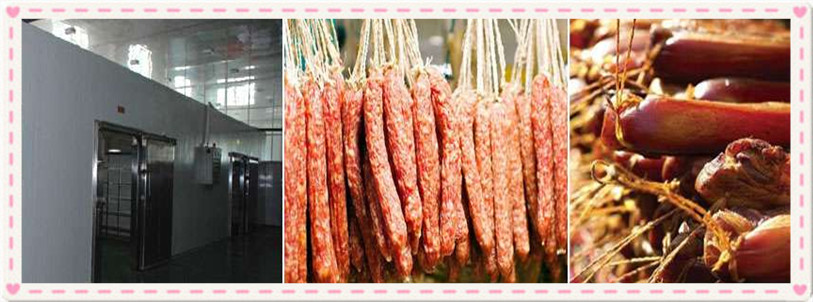 發(fā)色期和縮短定型期的操控,溫度操控在52到54度,濕度操控在45%左右、時刻為3到4個小時,臘腸逐漸從淺赤色轉(zhuǎn)為鮮赤色,腸衣開端縮短,這時一定要注意硬殼的呈現(xiàn),能夠進(jìn)行冷熱替換運用,效果好.